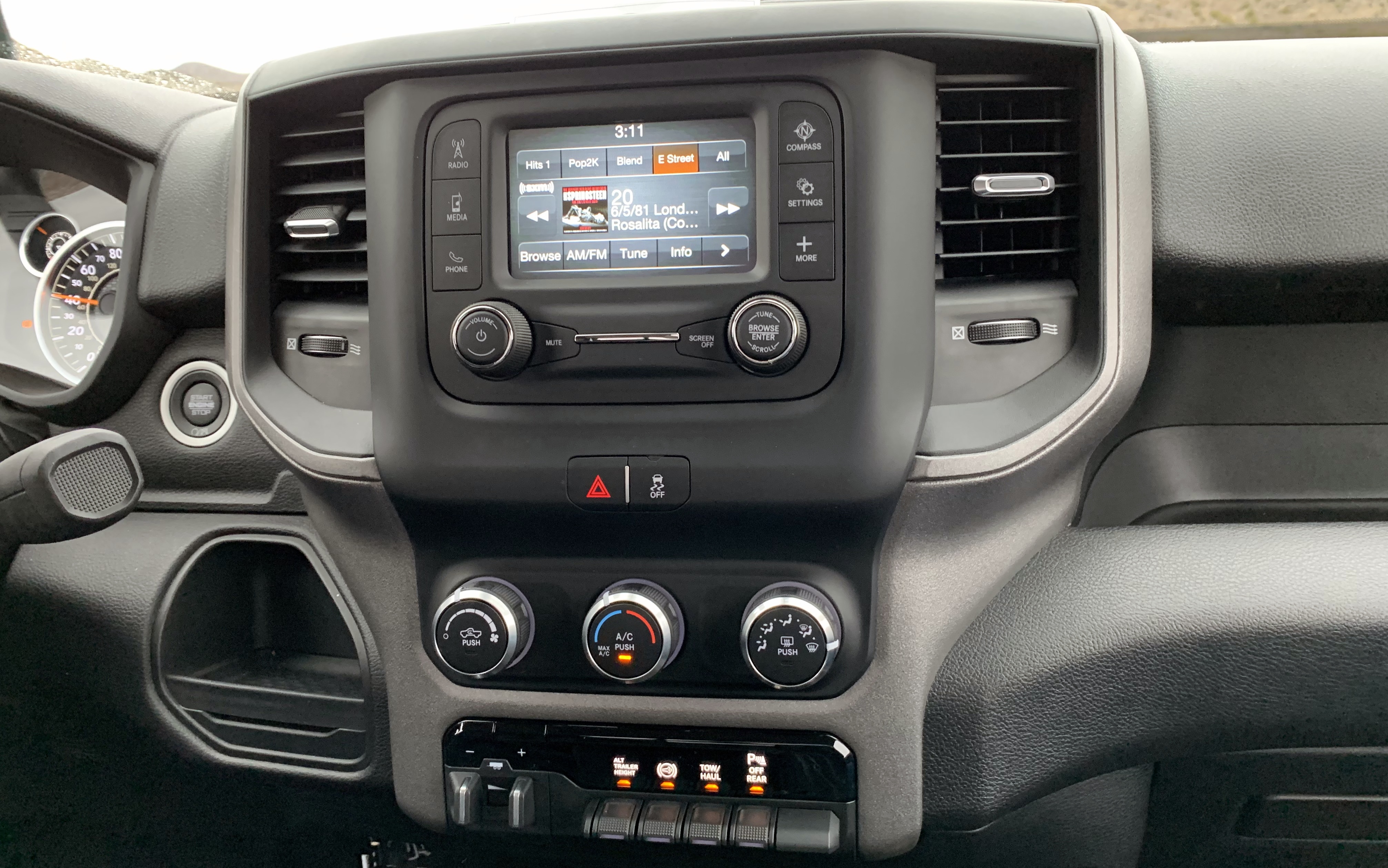 The Tradesman’s cloth seats are soft and yet made from exclusive work grade cloth. The truck also featured the 5.0-inch Uconnect touchscreen radio. While the Uconnect is sometimes hard to read compared to its giant 8.4-inch and 12.1-inch offerings in higher trim models, the system is responsive and offers big knobs that are great for when you are wearing thick work gloves. While climate control knobs look basic, they also feature a nice feel and are big enough to work with gloves on. The towing mirrors worked great, giving me enough reach to see completely around the trailer.