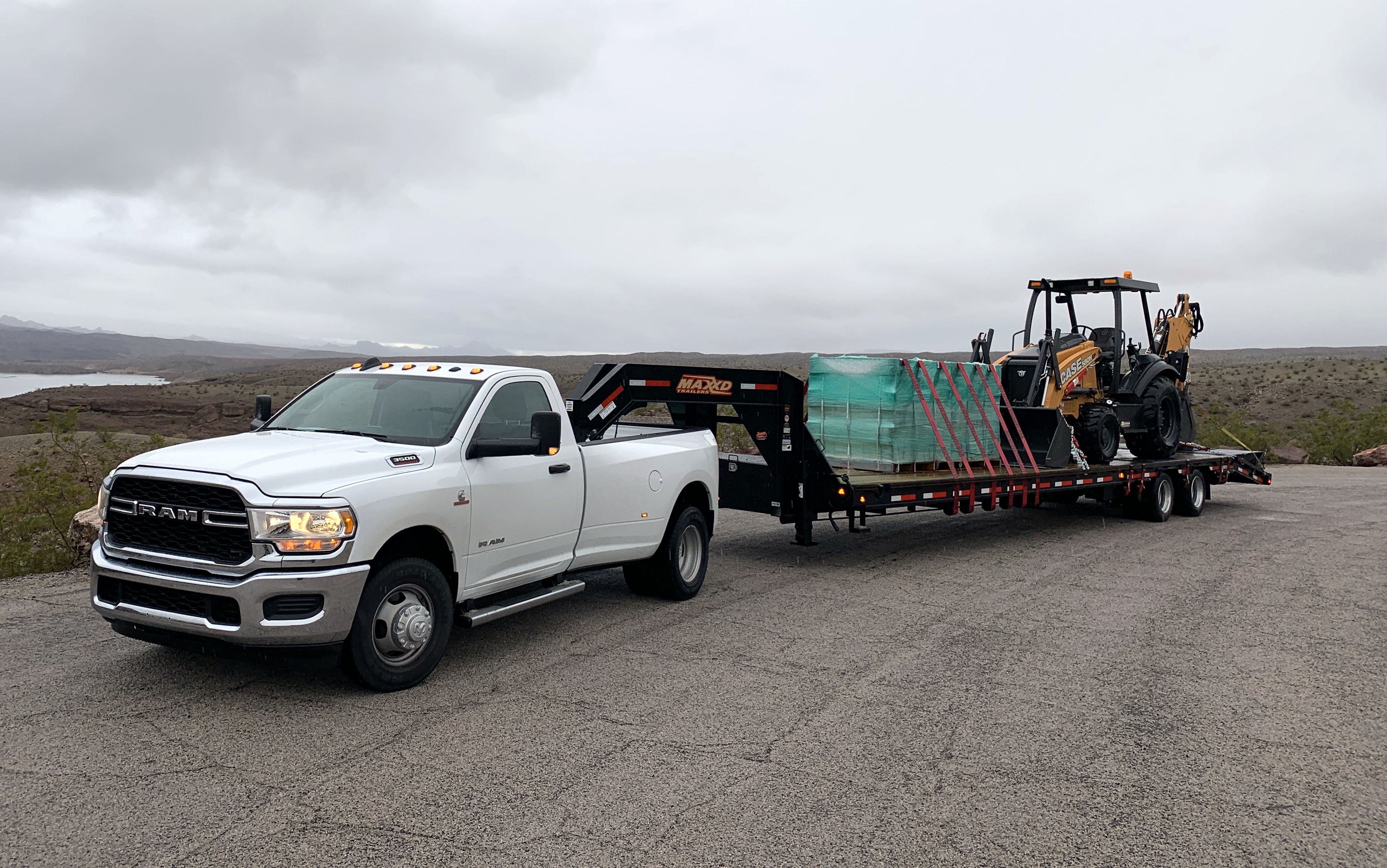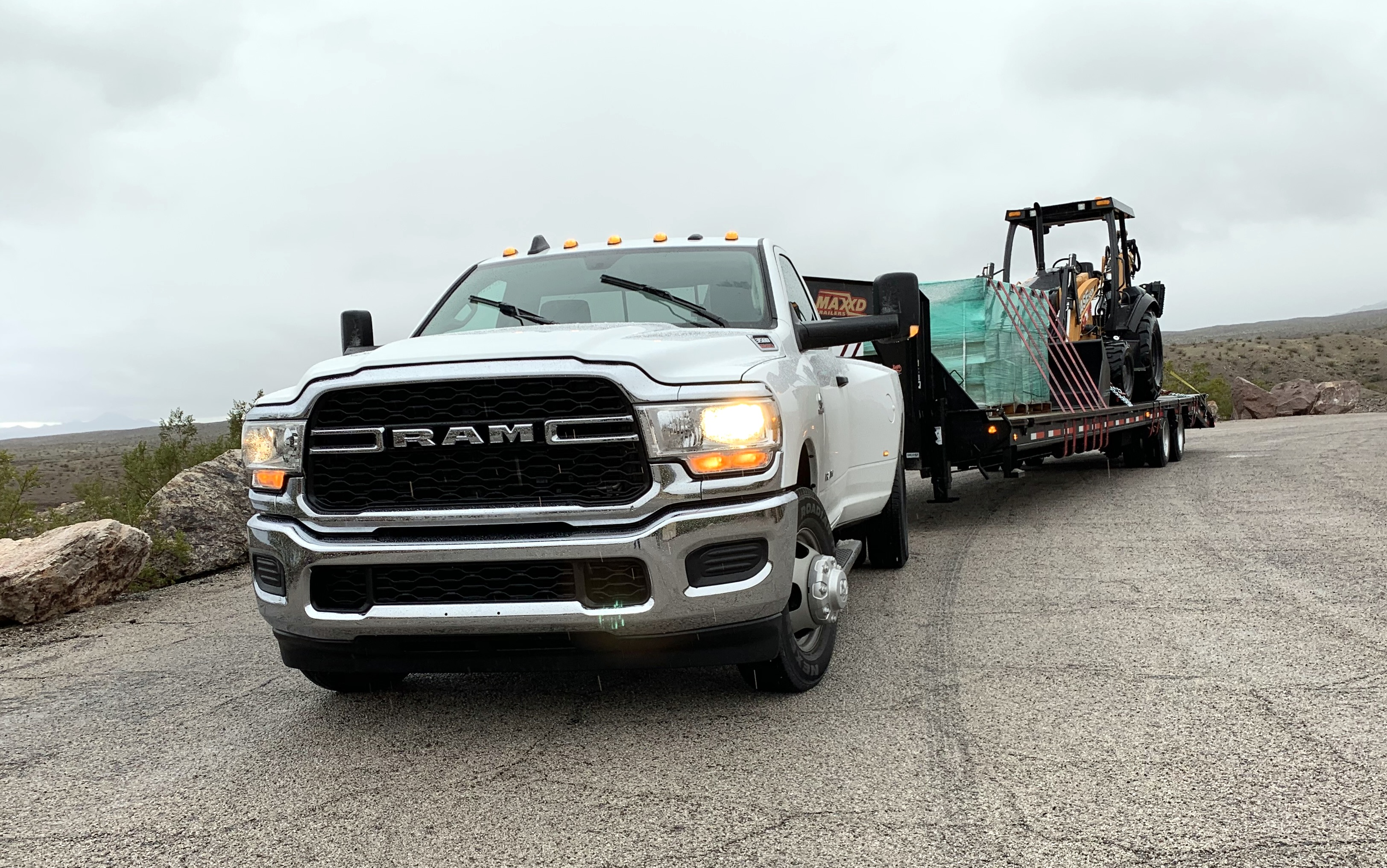 Ram was kind enough to load this truck to the max with 35,100 lbs. of Case backhoe and two pallets of weight hitched to the back of it. The new 6.7-liter H.O. Cummins had no trouble pulling the load. With a very aggressive engine brake and the optional Max Tow Package which gives the Ram 3500 a 4:10 rear axle ratio, this truck felt like it could pull anything. The 6-speed Aisin transmission provided swift shifting up the 6% grade with ease. The Max Tow Package also gave us the auto-leveling rear air suspension which allowed the trailer to stay perfectly level with the truck the whole way up the steep grade.