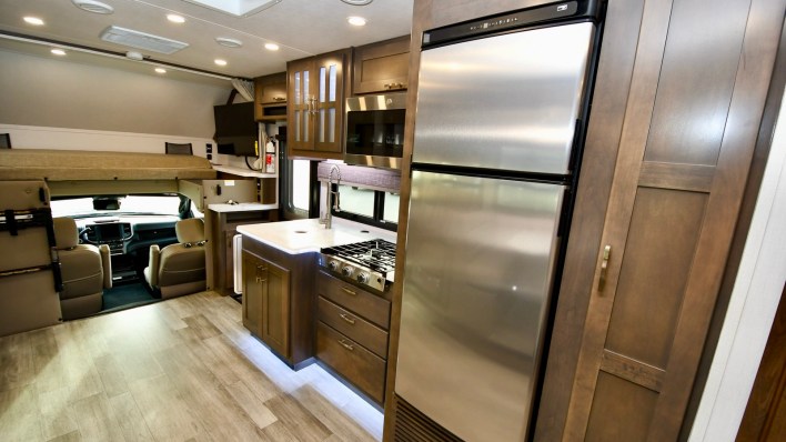 The bathroom in the Isata 5 30FW elevates the concept of mobile convenience. It’s designed with luxurious amenities, including a designer shower with a skylight for a bright, open bathing experience. The Oxygenics Body Spa showerheadoffers high water pressure while conserving water, an important feature for those who travel off-grid. A porcelain foot-flush toilet adds durability and comfort, while the stainless steel sink with a residential-style faucet brings added luxury. For optimal air circulation, the bathroom also comes equipped with a MaxxAir Power Vent.